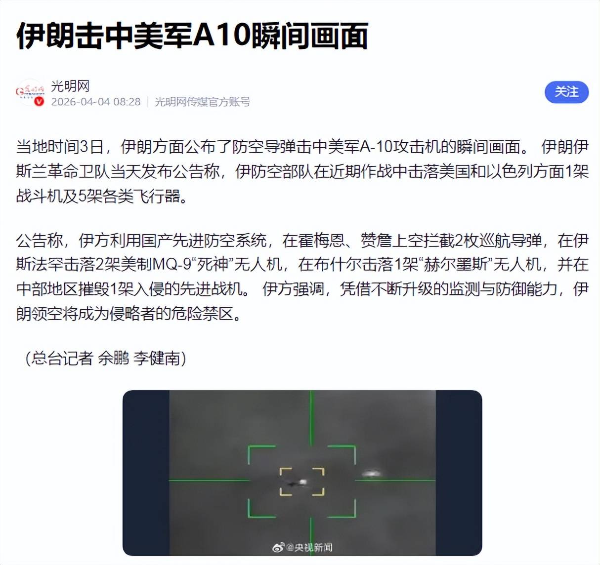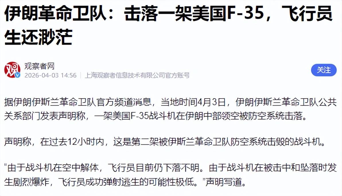 4月3日晚,《纽约时报》援引美国官员的言论确认,伊朗确实在其境内击落了美军战机,并表示机组人员的命运尚不明确,美方正在全力进行搜救,争取在伊朗之前找到幸存者。这是美国与以色列联手对伊朗展开军事行动以来,美国首次公开承认有美军战机被伊朗击落。