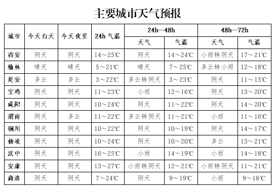 13日:全省多云转阴天,陕南南部局地有小雨或阵雨。