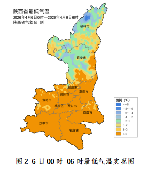 昨日陕北南部、关中及陕南最高气温较前一日上升2~9℃,升幅最大蓝田9.8℃,西安站上升9℃,陕南共11个区县日最高气温超过30℃;最高气温分布:陕北大部16℃~26℃,最高富县26.1℃;关中大部22℃~29℃,最高长安28.9℃,西安28.9℃;陕南大部26℃~33℃,最高旬阳32.6℃。今晨(截至06时)陕北部分、关中北部局地共29个区县273监测站最低气温低于0℃,最低神木市大保当镇摆言采-9.3℃,西安站13℃(图2)。