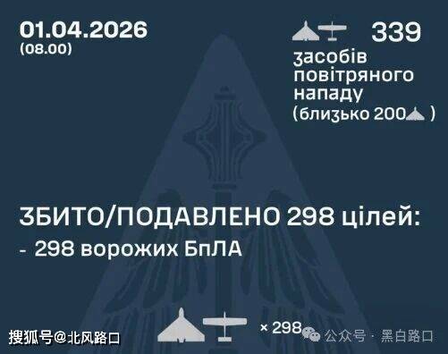 4月1日,俄罗斯发射339架无人机袭击乌克兰,乌军击落298架无人机,11个地点记录到撞击,5个地点有残骸落下。