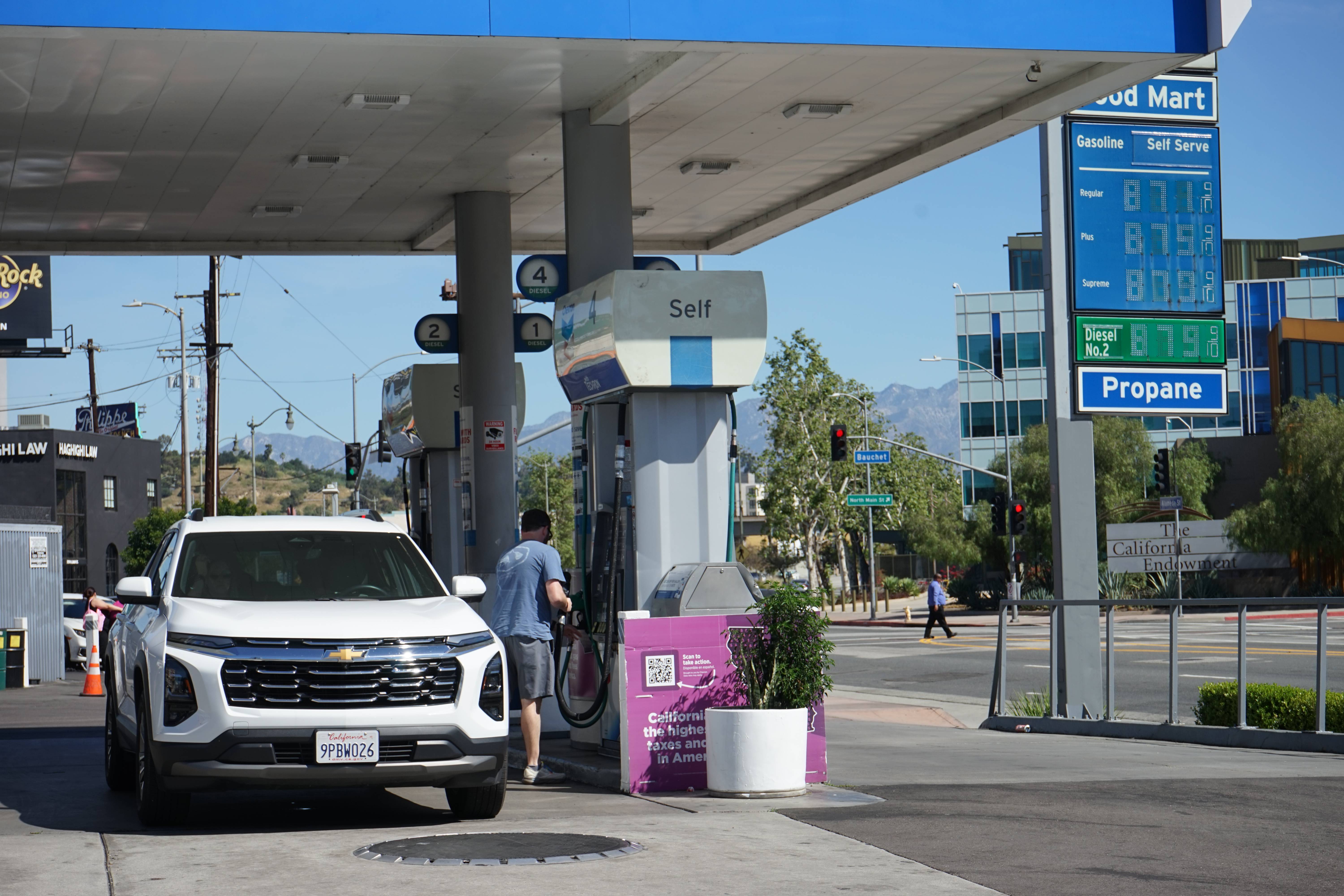 3月17日,顾客在美国加利福尼亚州洛杉矶市中心的一家加油站给车辆加油。新华社发(曾慧摄)