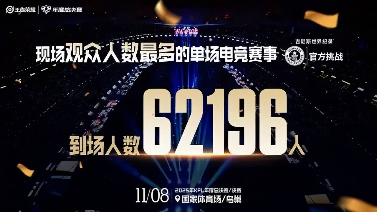 2025年11月8日,2025年KPL年度总决赛决赛在北京国家体育场鸟巢举行。据吉尼斯世界纪录官方认证,现场观众达62196人,打破“现场观众人数最多的单场电竞赛事”的世界纪录;2025年11月的王者荣耀世界冠军杯(Honor of Kings International Championship 2025,简称KIC)总决赛,则刷新了其国际赛事的观看记录。