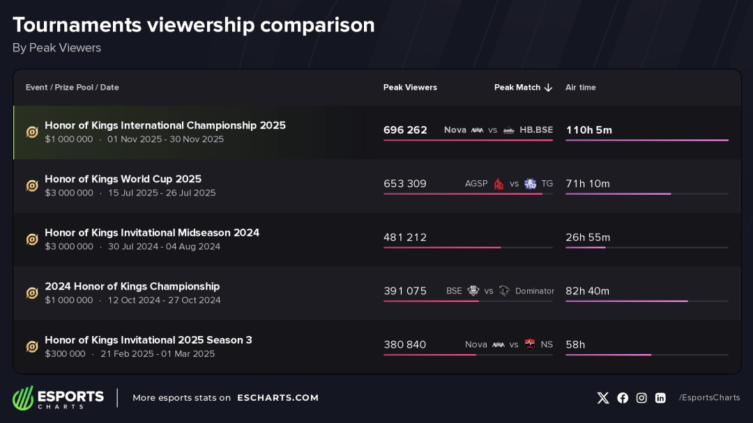 根据第三方数据机构 EsportsCharts 的统计,2025 年《王者荣耀》全球赛事总奖金池达到 2177 万美元,在全球电竞项目中位列第三,是移动电竞领域奖金规模最大的赛事生态 。